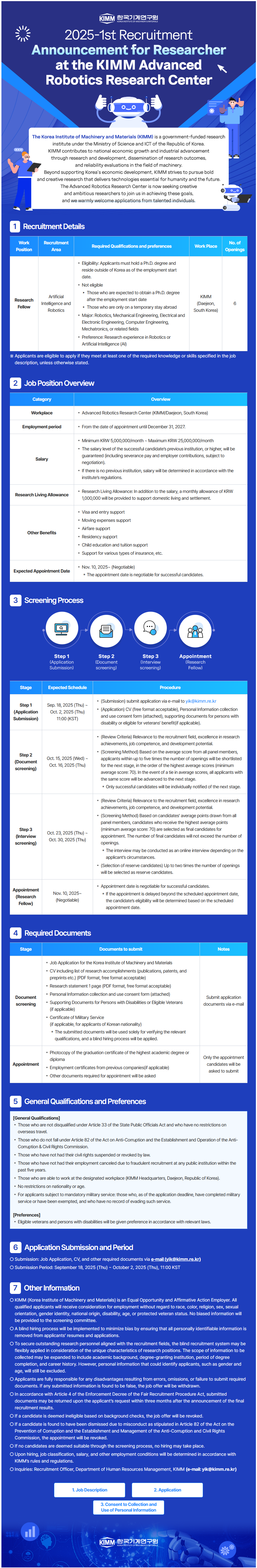 한국 기계연구원 (https://www.kimm.re.kr/#main) 에서 해외우수 과학 채용 중에 있습니다. 자세한 내용과 진행은 첨부된 공고문과 관련 서류들을 참고하시기 바랍니다. 공고문.docxDownload DOCX • 31KBJob Description.docxDownload DOCX • 17KBConsent to Collection and Use of Personal Information.docxDownload DOCX • 17KBApplication.docxDownload DOCX • 18KB